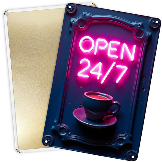 "OPEN 24/7" funny metal tin sign, novelty plaque decoration, suitable for home decoration, wall decoration, bathroom decoration, bar decoration, garage decoration, farmhouse decoration, a good gift for people, 20cm*30cm