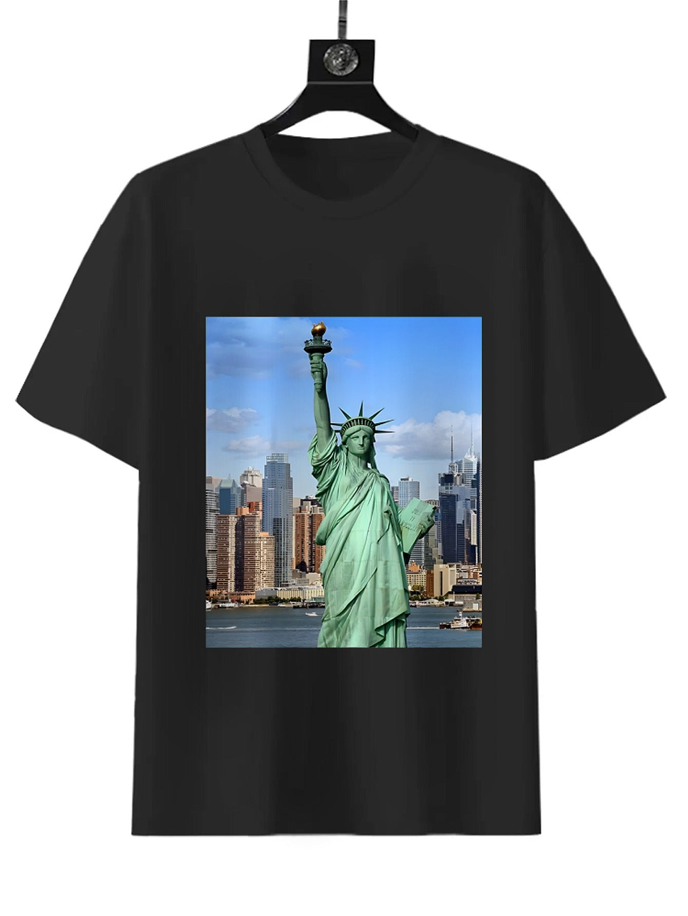 Hot!Fashion casual T-shirt, cool Statue of Liberty print, summer style short sleeve, black round neck loose cotton, soft material, suitable for daily wear